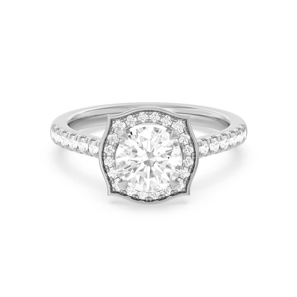 This woman's engagement ring features a round brilliant natural diamond in the centre, which is around by a diamond halo with an unique pattern. Smaller spherical stones are put in the halo in a brilliant design using special techniques. Round stones that delicately raise the central diamond from the cathedral setting in it provide the piece a striking and eye catching appearance. All Temple and Grace jewellery is beautifully crafted to the highest standards and is made at our jewellery workshop directly by us (skilled jewellery craftsmen). This is why you can save over 40% when compared to high-street retail prices. We also offer a lifetime warranty and unmatched 100 day returns. You can shop online or book an appointment to visit our jewellery boutiques in Sydney, Melbourne, Brisbane and Perth.