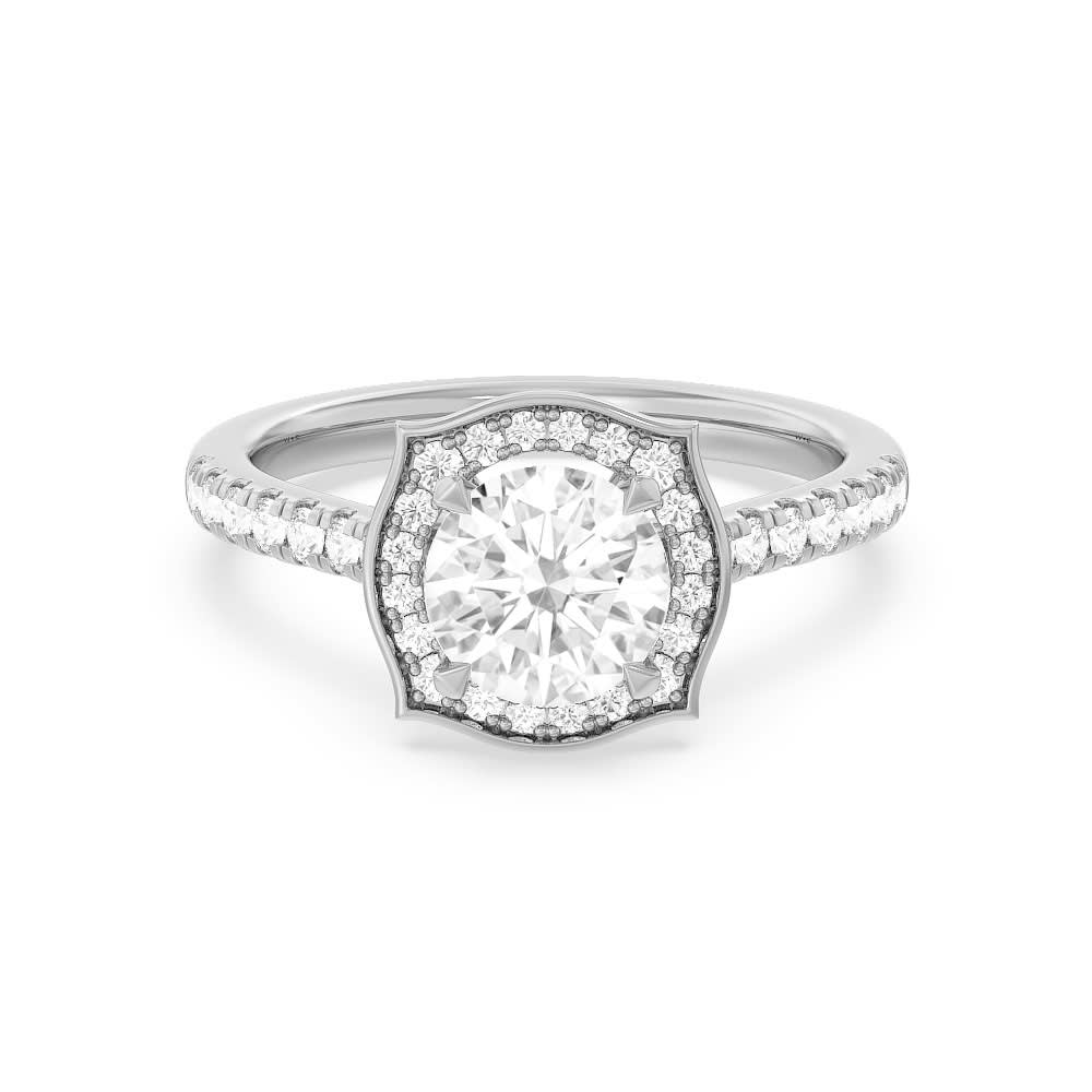 This woman's engagement ring features a round brilliant natural diamond in the centre, which is around by a diamond halo with an unique pattern. Smaller spherical stones are put in the halo in a brilliant design using special techniques. Round stones that delicately raise the central diamond from the cathedral setting in it provide the piece a striking and eye catching appearance. All Temple and Grace jewellery is beautifully crafted to the highest standards and is made at our jewellery workshop directly by us (skilled jewellery craftsmen). This is why you can save over 40% when compared to high-street retail prices. We also offer a lifetime warranty and unmatched 100 day returns. You can shop online or book an appointment to visit our jewellery boutiques in Sydney, Melbourne, Brisbane and Perth.