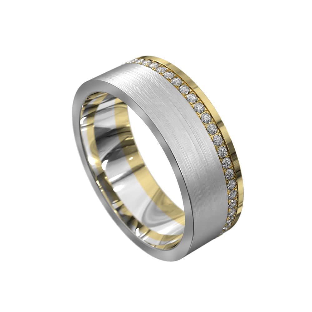 This men's wedding ring features a full round, flat profile, providing a sleek and modern look. One side of the ring is polished to a high shine, creating a lustrous surface. Brush detailing, on the other hand, adds texture and depth. A series of sparkling diamonds are set all around the band, highlighting the brilliance and beauty of these precious stones. All Temple and Grace jewellery is beautifully crafted to the highest standards and is made at our jewellery workshop directly by us (skilled jewellery craftsmen). This is why you can save over 40% when compared to high-street retail prices. We also offer a lifetime warranty and unmatched 100 day returns. You can shop online or book an appointment to visit our jewellery boutiques in Sydney, Melbourne, Brisbane, Perth and Adelaide.
