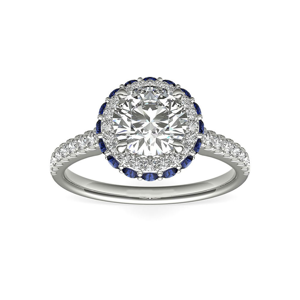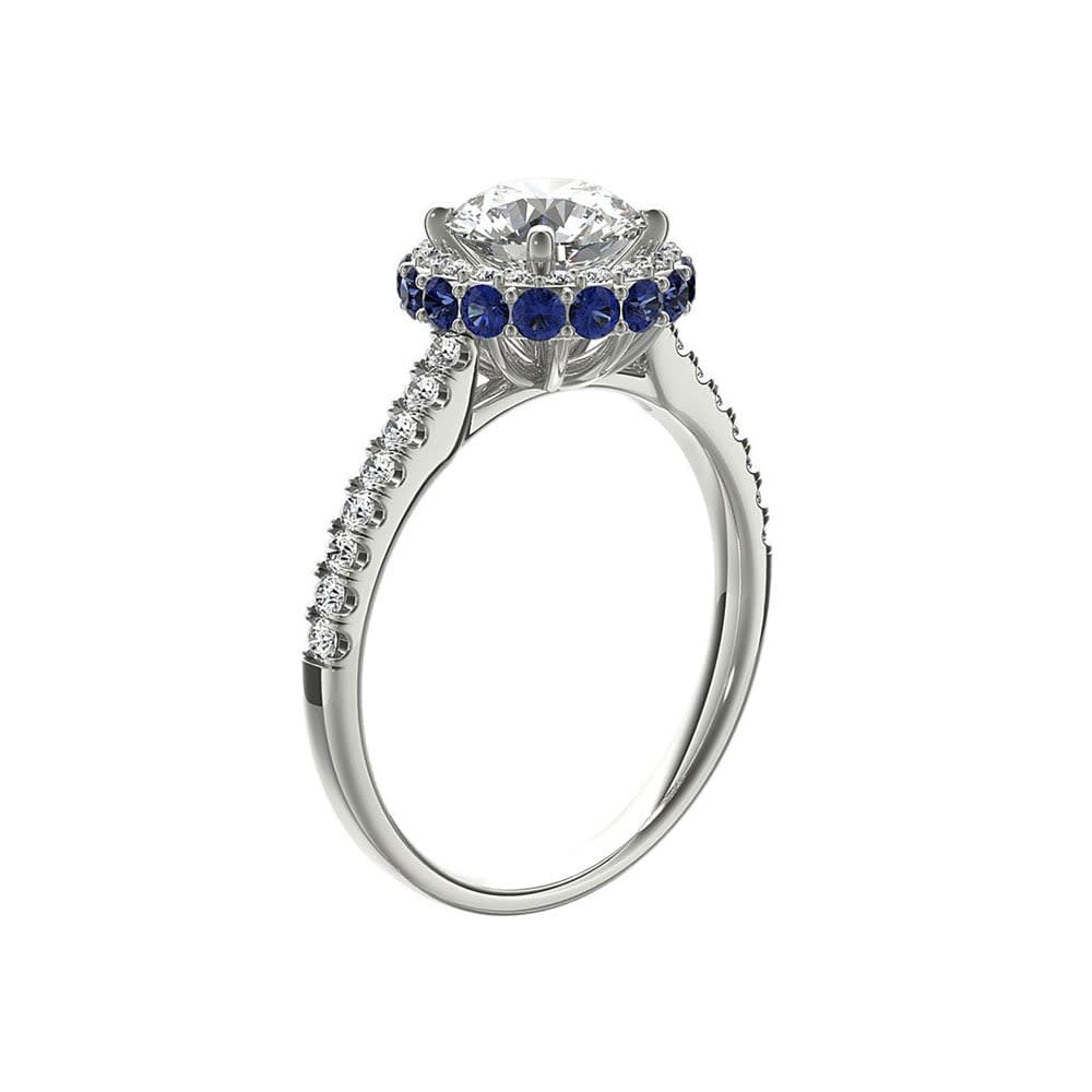 An absolute stunner, this stunning hidden sapphire diamond engagement ring fully embraces the trend. The elegant diamond-paved shank is embellished with a certified claw set 0.90 carat diamond surrounded by a row of diamonds and blue sapphires on the sides creating a halo effect. This timeless jewel effortlessly captures attention with its rich design. This band is available in 18K white, yellow, rose gold, and platinum 950. The jewellery is beautifully handmade to the highest standards. Shop directly from us and save over 40% when compared to high-street retail prices. We also offer unmatched 100 day returns. Buy online or book an appointment to visit our jewellery boutiques in Sydney and Melbourne.
