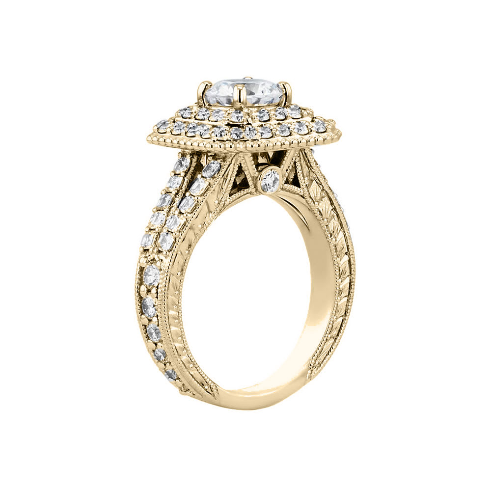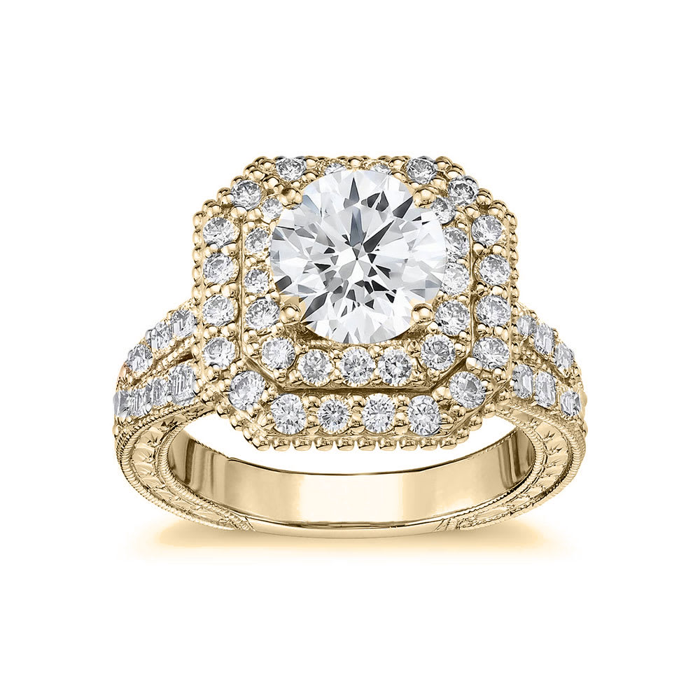 Bright and modern, this diamond engagement ring looks exquisitely charming. A double halo of certified 0.70 carat round diamonds sits atop a split shank paved with asscher cut diamonds. The glittering accents with dainty etched milgrain work on the shoulders offer a sophisticated appeal. This ring is available in 18K white, yellow, rose gold, and platinum 950. The jewellery is beautifully handmade to the highest standards. Shop directly from us and save over 40% when compared to high-street retail prices. We also offer unmatched 100 day returns. Buy online or book an appointment to visit our jewellery boutiques in Sydney and Melbourne.