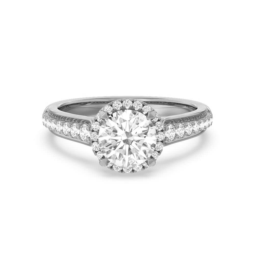 A round brilliant natural diamond serves as the centre point of this women's engagement ring, which is encircled by a halo of sparkling diamonds. The diamond halo around the primary stone gives it more shine and elegance. Shiny spherical stones decorate the cathedral's setting. The band's unique, twisted aesthetic lends it a dash of creativity and personality. All Temple and Grace jewellery is beautifully crafted to the highest standards and is made at our jewellery workshop directly by us (skilled jewellery craftsmen). This is why you can save over 40% when compared to high-street retail prices. We also offer a lifetime warranty and unmatched 100 day returns. You can shop online or book an appointment to visit our jewellery boutiques in Sydney, Melbourne, Brisbane and Perth.