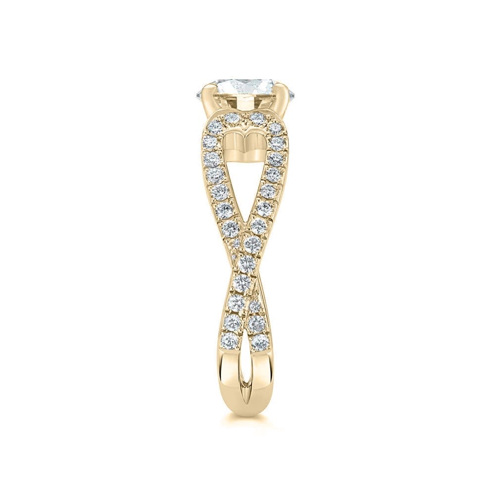 Modern and classic, the infinity inspired engagement band is truly magnificent. It is composed of a GIA certified 0.50 carat claw set diamond on a heart-shaped split band adorned with two elegant rows of round brilliant pave diamonds. This striking 18K white gold engagement ring with a twisted shank exudes a distinctive and magnetic charm. It is available in 18K white, yellow, rose gold, and platinum 950. The jewellery is beautifully handmade to the highest standards. Shop directly from us and save over 40% when compared to high-street retail prices. We also offer unmatched 100 day returns. Buy online or book an appointment to visit our jewellery boutiques in Sydney and Melbourne.