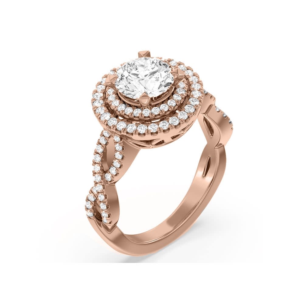 The centrepiece of this women's engagement ring is a round, brilliant natural diamond. Two halos made up of small stones encircle the central diamond. Shiny stones that form a delicate crisscross design on it's shanks enhance to the piece's overall elegance and sophistication. It is ideal for women who enjoy jewellery that is glitzy, striking, and has a distinctive flair. All Temple and Grace jewellery is beautifully crafted to the highest standards and is made at our jewellery workshop directly by us (skilled jewellery craftsmen). This is why you can save over 40% when compared to high-street retail prices. We also offer a lifetime warranty and unmatched 100 day returns. You can shop online or book an appointment to visit our jewellery boutiques in Sydney, Melbourne, Brisbane and Perth.
