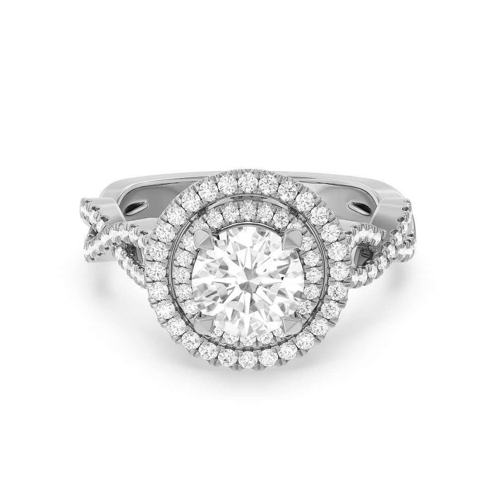 The centrepiece of this women's engagement ring is a round, brilliant natural diamond. Two halos made up of small stones encircle the central diamond. Shiny stones that form a delicate crisscross design on it's shanks enhance to the piece's overall elegance and sophistication. It is ideal for women who enjoy jewellery that is glitzy, striking, and has a distinctive flair. All Temple and Grace jewellery is beautifully crafted to the highest standards and is made at our jewellery workshop directly by us (skilled jewellery craftsmen). This is why you can save over 40% when compared to high-street retail prices. We also offer a lifetime warranty and unmatched 100 day returns. You can shop online or book an appointment to visit our jewellery boutiques in Sydney, Melbourne, Brisbane and Perth.