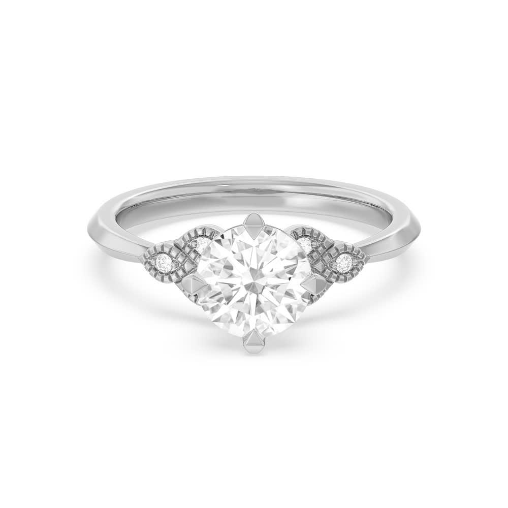 A round brilliant natural diamond is placed in a sturdy four prong setting on this women's engagement ring. It features a distinctive grooved design on it's shoulders on either side of the focal diamond. One tiny round stone, beautifully set to offer extra glitter and grace, is added as an accent to each groove. All Temple and Grace jewellery is beautifully crafted to the highest standards and is made at our jewellery workshop directly by us (skilled jewellery craftsmen). This is why you can save over 40% when compared to high-street retail prices. We also offer a lifetime warranty and unmatched 100 day returns. You can shop online or book an appointment to visit our jewellery boutiques in Sydney, Melbourne, Brisbane and Perth.