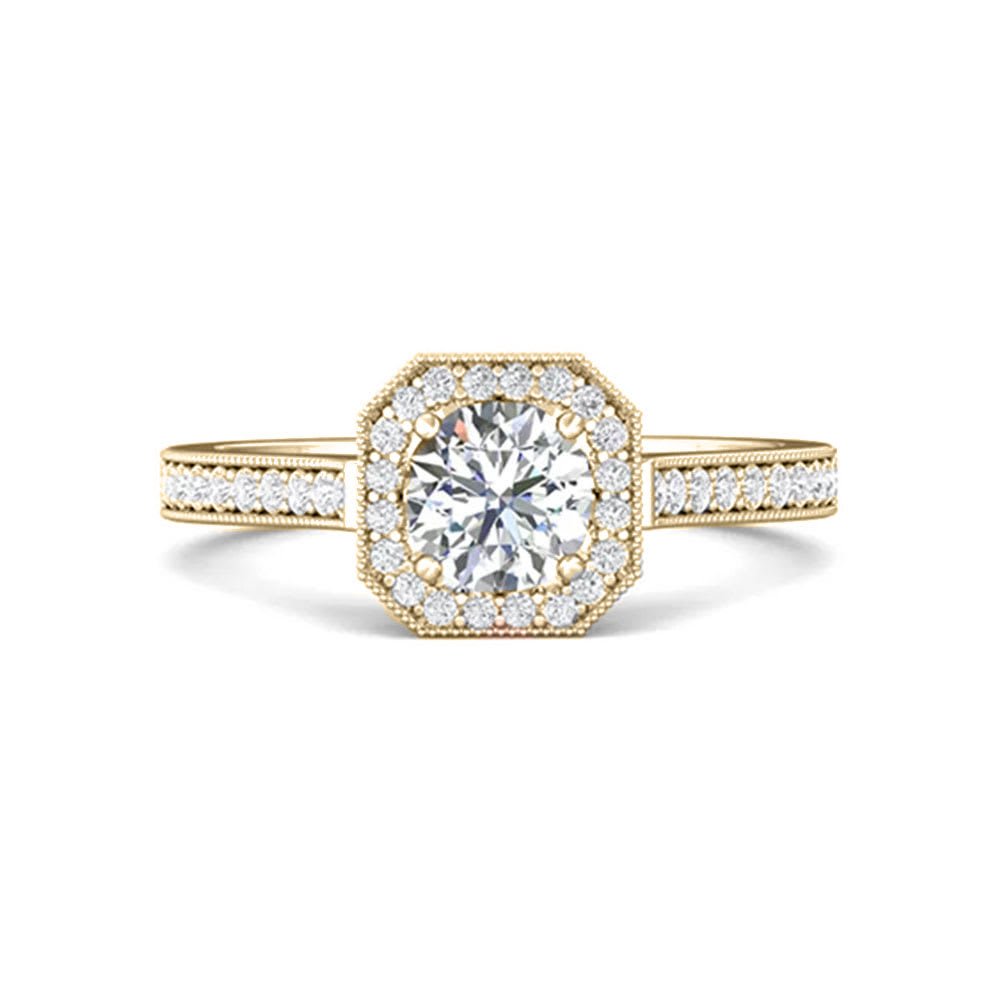 This round diamond engagement ring flaunts an alluring look and is absolutely striking. It displays a glistening diamond halo with a hexagonal milgrain frame that encircles the prong-set centre 0.60 carat diamond. Sparkling round diamonds on the shank with milgrain edges captures attention with their breathtaking brilliance. The ring is available in 18K white, yellow, rose gold, and platinum 950. The jewellery is beautifully handmade to the highest standards. Shop directly from us and save over 40% when compared to high-street retail prices. We also offer unmatched 100 day returns. Buy online or book an appointment to visit our jewellery boutiques in Sydney and Melbourne.