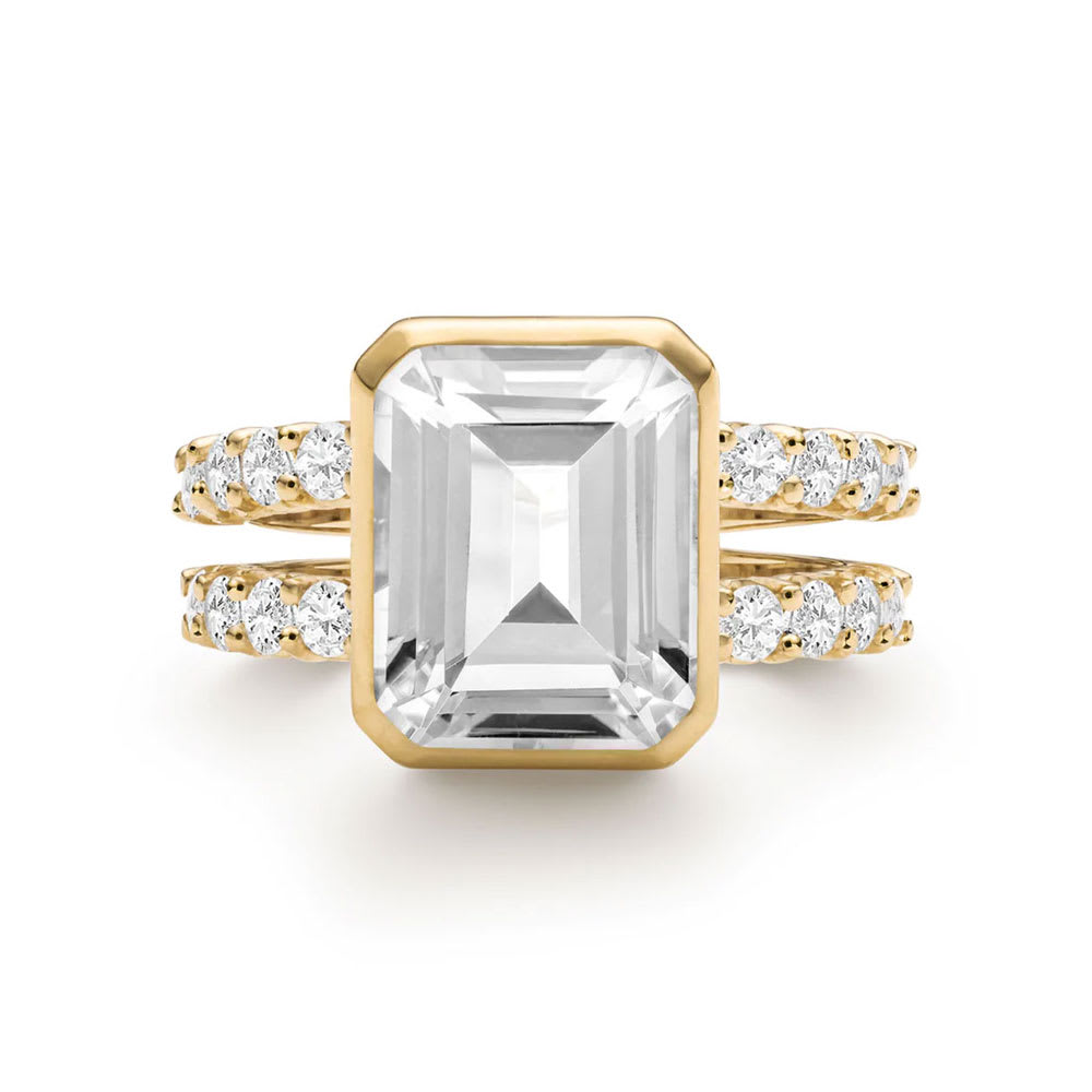 This iconic statement piece features a striking emerald cut white topaz as its focal point, which is hand set in a gold bezel and enhanced with stunning round cut diamonds. The split shank band provides a strong yet light setting. All Temple and Grace jewellery is beautifully crafted to the highest standards and is made at our jewellery workshop directly by us (skilled jewellery craftsmen). This is why you can save over 40% when compared to high-street retail prices. We also offer a lifetime warranty and unmatched 100 day returns. You can shop online or book an appointment to visit our jewellery boutiques in Sydney, Melbourne, Brisbane and Perth.