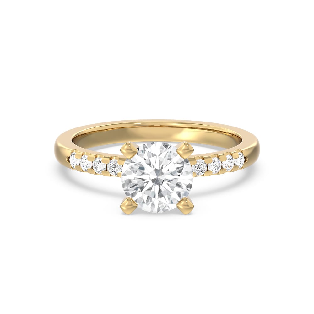 This women's engagement ring features a lab grown round brilliant diamond that has been set in a strong and secure four prong setting. It's shoulders have been beautifully embellished with round stones, adding an extra layer of glamour and sophistication to it. It has been crafted with round and polished edges, giving it a timeless and refined appearance. It is the perfect choice for a woman who values both style and quality. All Temple and Grace jewellery is beautifully crafted to the highest standards and is made at our jewellery workshop directly by us (skilled jewellery craftsmen). This is why you can save over 40% when compared to high-street retail prices. We also offer a lifetime warranty and unmatched 100 day returns. You can shop online or book an appointment to visit our jewellery boutiques in Sydney, Melbourne, Brisbane and Perth.